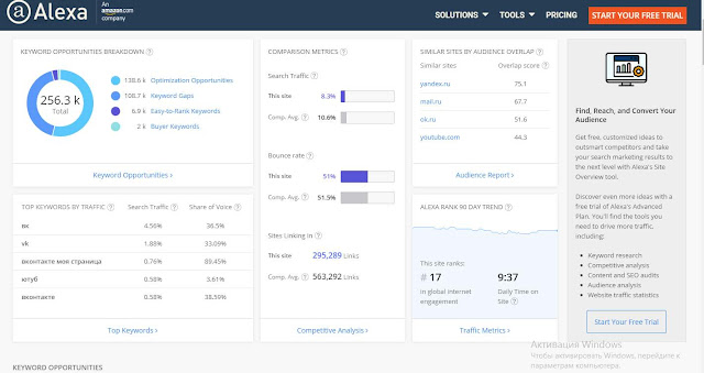 С помощью Alexa Toolbar вы можете провести анализ сайтов конкурентов, посмотреть расширенную статистику посещений и какое место занимает ваш веб-ресурс относительно других сайтов и блогов. Но, не обольщайтесь, друзья. Такая статистика доступна только для ресурсов с показателем Алекса ранк от 100000 и менее. У меня, как вы уже видели, он равен 156682. Мне рано мечтать об этом, но есть к чему стремиться!