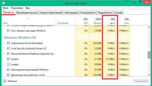 На вкладке «Процессы» следует обратить внимание на проценты в верхней части столбца «Диск». Если на красном фоне отображается значение сто процентов или близкое к нему, это верный признак того, что диск перегружен