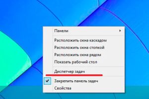 Клацнуть правой кнопкой мышки по панели задач, найти в списке «Диспетчер» и открыть его. Или зажать одновременно комбинацию клавиш Alt+Ctrl+Delete